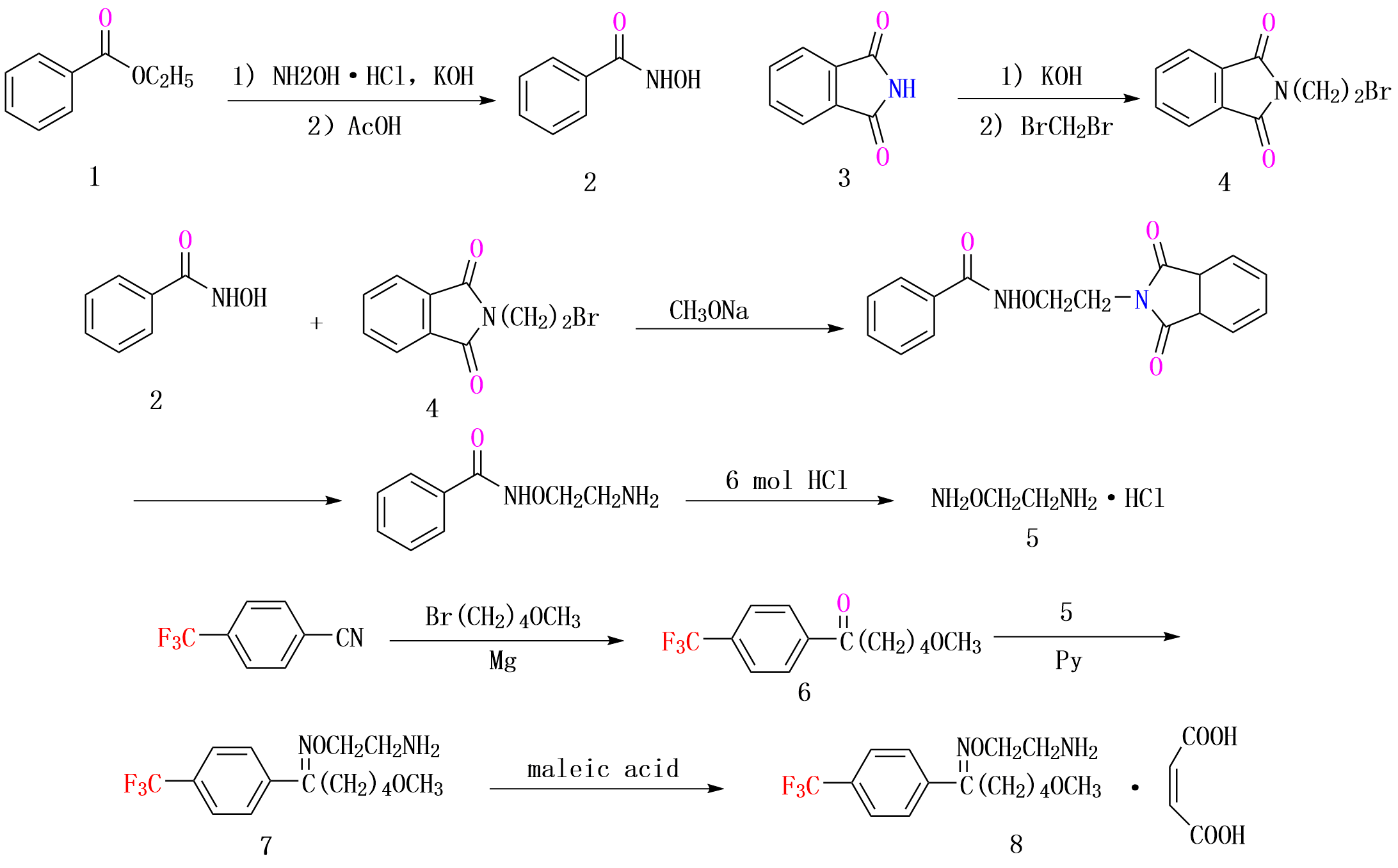 氟伏沙明的合成国内未见报道,本课题组以苯甲酸乙酯1为起始原料,经取代、氨解、水解、成盐4步反应合成马来酸氟伏沙明,总收率为51%(见图1)。将苯甲酸乙酯与盐酸羟胺反应高收率地制得苯甲酰胲2,收率98%。在中间体4的制备中,通过改变反应物的摩尔比,增加1,2-二溴乙烷的用量,可提高反应收率至85%。通过2与4缩合、肼解再水解,一锅法制得关键中间体2-氨氧基-1-乙胺二盐酸盐(5)。本课题组对该反应所用的溶剂、温度、反应物摩尔比等条件做了大量对比实验,优化了工艺。4-甲氧基-1-溴丁烷的格氏试剂与对三氟甲基苯甲腈在四氢呋哺中回流反应,盐酸水解得到另一关键中间体(4-甲氧丁基)(4-三氟甲苯基)甲酮6。5和6在乙醇中缩合得到氟伏沙明7,7与马来酸成盐得到最终目标产物马来酸氟伏沙明(8)。