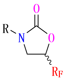 将氟原子引入到化合物中会极大地改变化合物的性质,包括生理活性、化学性质以及物理性质等。由于氟原子的范德华半径与氢原子最为接近,在生物体内易产生拟伪效应和阻断效应,使得化合物的生理活性发生改变;在化合物中引入氟原子还会增加化合物的脂溶性,从而使得一些药物在人体内对膜和组织的穿透力增强;由于氟原子的高电负性,将其引入化合物所形成的共价键极性很强,从而使得化合物更为稳定。将氟原子引入到噁唑烷酮中,可能会产生拟伪效应和阻断效应使其抗菌活性更强,并且使其脂溶性增加,更易被人体吸收。因此,将氟原子引入到噁唑烷酮中引起了化学工作者们的极大兴趣。本课题组前期工作集中在烷基化反应,在研究4-戊烯酸的氟烷基化反应中得到了O-环合产物含氟烷基的内酯;在研究丁醇的氟烷基化加成反应中得到了O-环合产物含氟烷基的呋喃环。作为研究的补充,本课题组通过芳香基烯丙基氨基甲酸酯的氟烷基化加成O-环合得到了5-氟烷基噁唑烷酮,结构式如图所示: