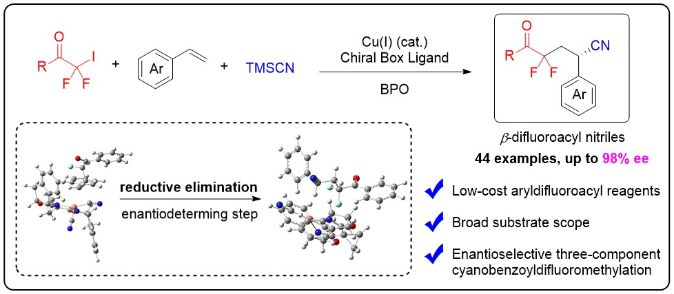 工程中心团队长期致力于二氟酮化合物的开发,二氟酮结构存在于很多高活性的药物分子结构中,而且手性二氟烷基腈类化合物是当前的研究热点。因此团队开发了一种铜催化下偕二氟烷基酮(RCOCF2I)、烯烃和TMSCN参与的不对称双官能团化反应,用于合成手性二氟酰基取代的腈类化合物。使用了廉价的过渡金属CuTc,手性双噁唑啉配体,以及BPO作为自由基引发剂,进行了烯烃的二氟苯甲酰化氰基化反应研究,以良好的收率和优异的对映选择性获得手性β-二氟酰基腈,44个例子,且ee值达到98%,显示了官能团兼容性和优异的选择性。此外,还进行了DFT计算研究以深入了解立体化学结果,计算和实验结果与CuI/CuII/CuIII催化循环的假设一致,其中CuIII物种的还原消除作为立体决定步骤。