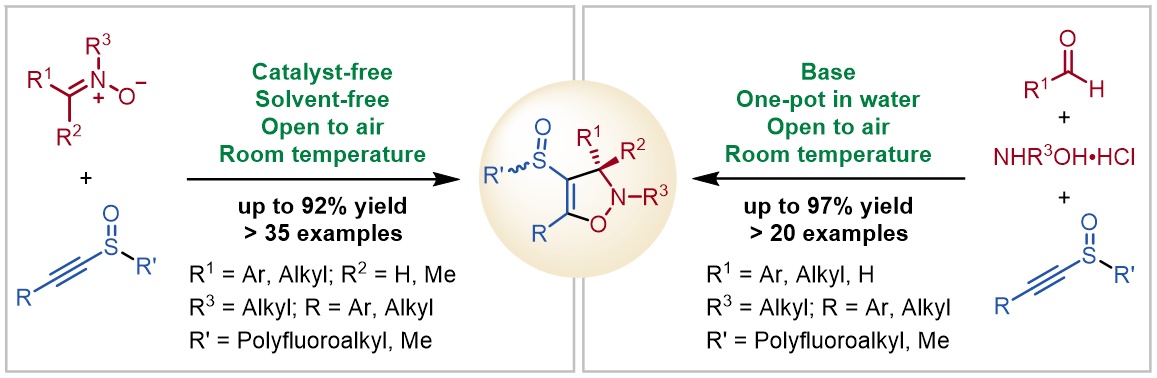 4-异噁唑啉不仅是生物活性分子的重要骨架,也是制备多种环状和非环状化合物的重要中间体。含氟烷基以及亚砜基的杂环结构广泛存在于活性化合物中,多种结构被成功地应用于医药、农药、材料等领域。近日,上海绿色氟代制药工程技术研究中心刘振江教授团队开发了两种绿色简便的方法,用于合成多氟烷基亚磺酰基或烷基亚磺酰基4-异噁唑啉。即在室温且无催化剂和无溶剂条件下,醛和酮衍生的硝酮类化合物与α-炔基(多氟)烷基亚砜能够高效地进行区域选择性的1,3-偶极环加成反应以制备具有双手性中心的4-异噁唑啉,且这一对非对映异构体可以通过结晶或柱层析分离。进一步改进的水相一锅法省去了硝酮的分离步骤,以醛、羟胺盐酸盐和α-炔基(多氟)烷基亚砜为原料,极少量的水作为溶剂,当量的碱作为缚酸剂,便可简便高效地实现这类结构的合成。这两种“绿色”方法均可进行具有应用价值的克级规模放大,若使用光学纯的亚砜底物,还可获得光学活性的亚磺酰基-4-异噁唑啉类化合物,这类化合物含有药物或农药分子中常见的活性片段,具有很好的活性研究价值。相关研究成果发表于Green Chemistry(Green Chem.2023, 25, 5233-5239; DOI: 10.1039/D3GC00557G)。